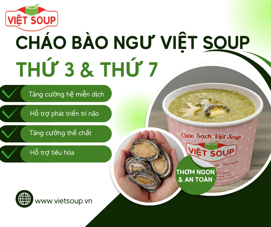 Đừng bỏ lỡ cơ hội mang đến bữa ăn dinh dưỡng cao cấp cho bé , mẹ hãy ghé Việt Soup vào thứ 3 và thứ 7 hàng tuần để thưởng thức cháo bào ngư thơm ngon, bổ dưỡng ngay nhé!