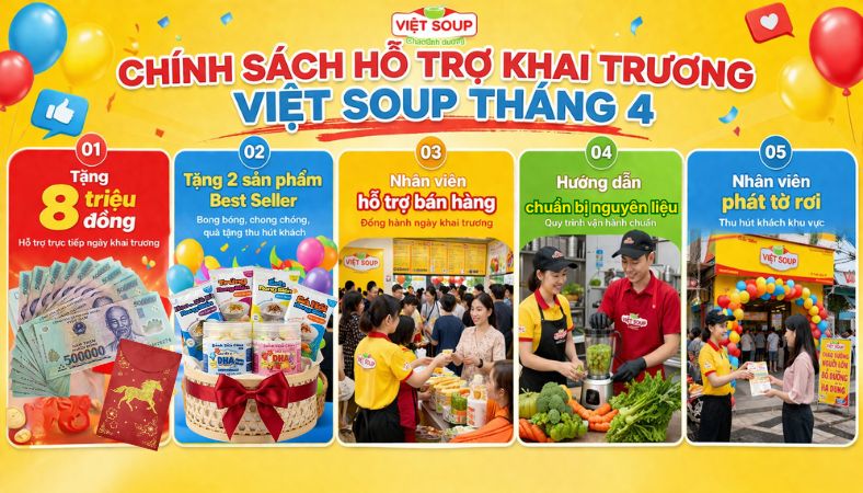 - Tháng 4 này, Việt Soup triển khai chương trình ưu đãi đặc biệt dành cho đối tác mới với chính sách tặng 8 triệu đồng khi mở cửa hàng cháo dinh dưỡng Việt Soup tháng 4. Nếu bạn đang tìm kiếm một hướng kinh doanh phù hợp, đây chính là thời điểm lý tưởng để bắt đầu cùng Việt Soup.