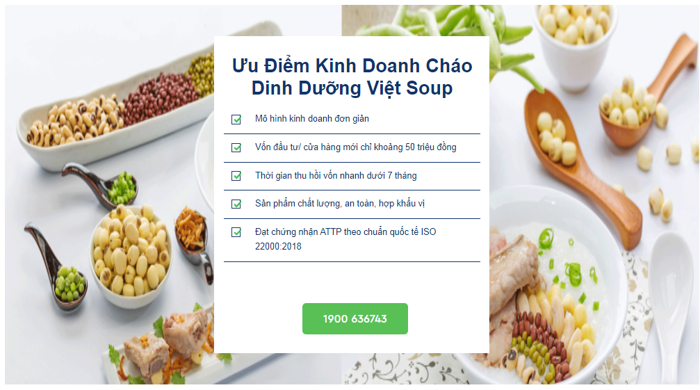 - Việt Soup – Thương hiệu cháo dinh dưỡng hàng đầu – chính là lời giải hoàn hảo, mang đến cơ hội khởi nghiệp an toàn, đúng luật và sinh lời ổn định.
