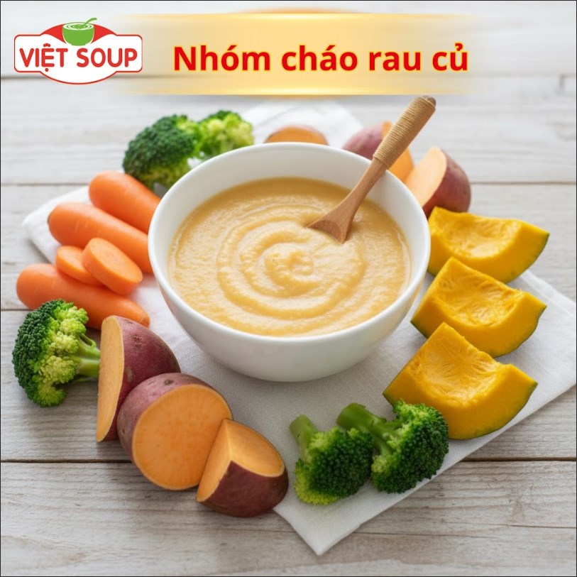 Ba mẹ có thể nấu cháo bí đỏ, cà rốt, khoai lang, bông cải xanh, rau dền hoặc rau mồng tơi. Rau củ giúp bổ sung vitamin, chất xơ, hỗ trợ tiêu hóa và giảm táo bón rất hiệu quả trong những ngày Tết ăn uống thất thường.
