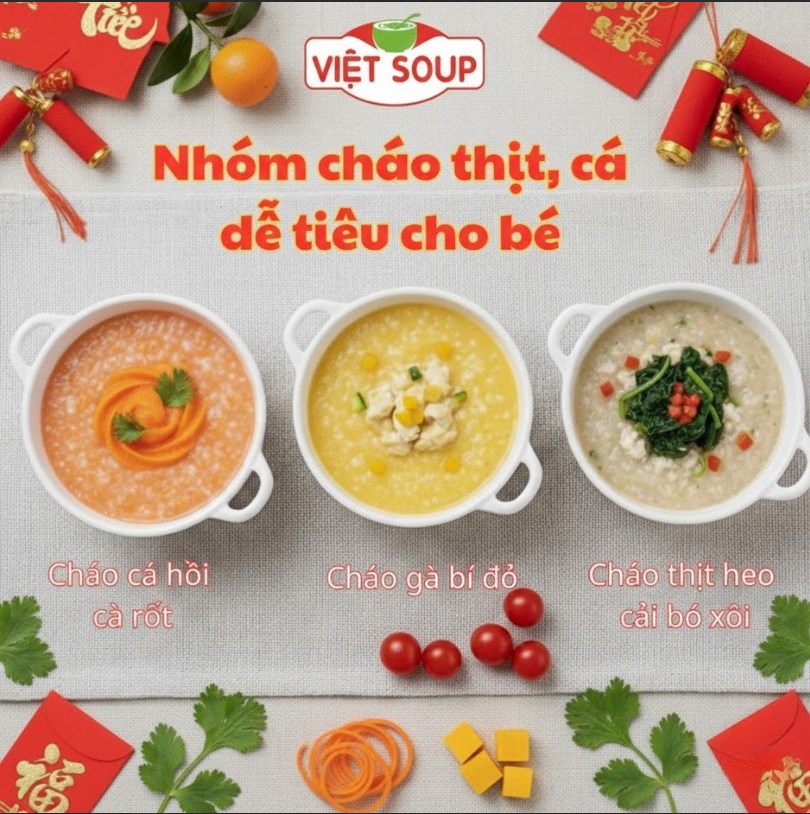 Cháo cá hồi cà rốt, cháo gà bí đỏ hay cháo thịt heo cải bó xôi đều là những món dễ ăn, dễ tiêu, phù hợp cho bé trong những ngày Tết ăn uống thất thường. Việc duy trì nhóm cháo này trong thực đơn cháo dinh dưỡng cho bé ngày Tết giúp bé không bị thiếu đạm dù có lỡ ăn nhiều bánh kẹo hơn ngày thường.