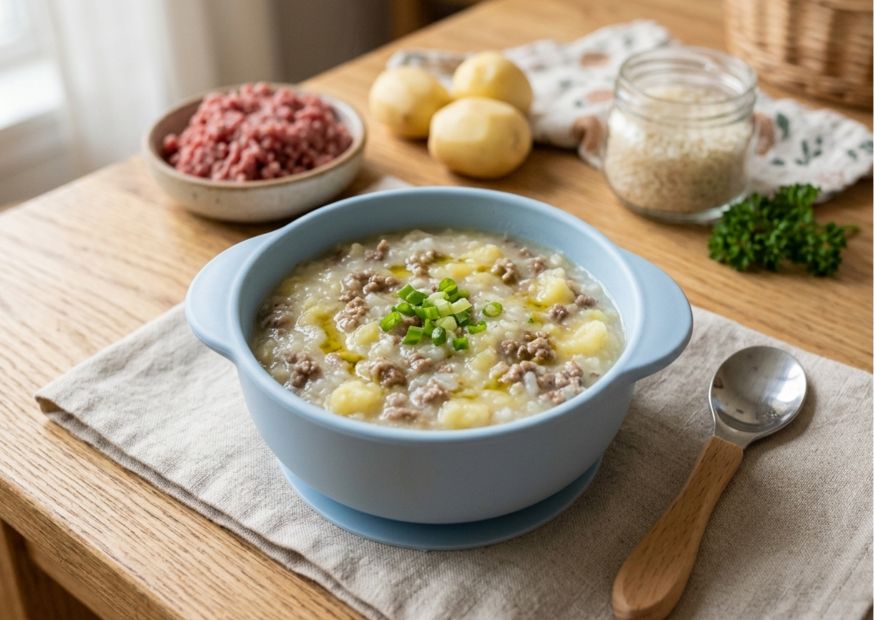 Thịt bò giàu kẽm và protein, giúp phát triển cơ bắp. Khoai tây cung cấp năng lượng và giúp cháo có độ sánh mịn tự nhiên mà không cần quá nhiều tinh bột.