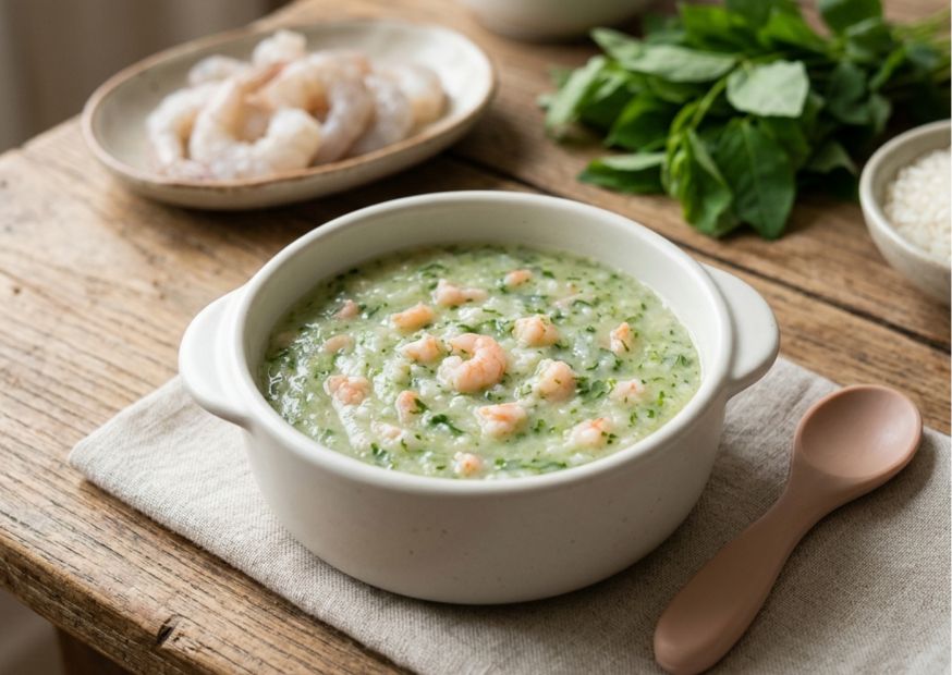 4. Công thức cháo dinh dưỡng tôm tươi rau ngót – Thanh nhiệt, giải độc