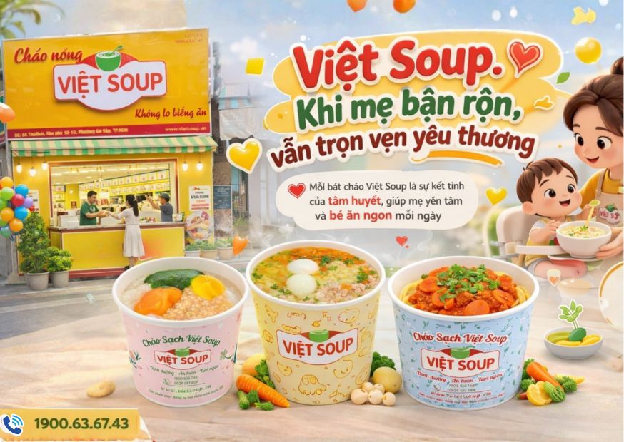 Mỗi bát cháo Việt Soup là sự kết tinh của tâm huyết, giúp mẹ tiết kiệm thời gian mà vẫn đảm bảo con yêu nhận được nguồn dưỡng chất tốt nhất. Nếu một ngày mẹ quá bận rộn, hãy để Việt Soup thay mẹ chăm sóc bữa ăn cho bé bằng những công thức cháo dinh dưỡng đa dạng và đậm đà nhất.